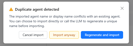 ⚠️ Note: If you import an agent with a duplicate name, a prompt dialog will appear. You can choose: