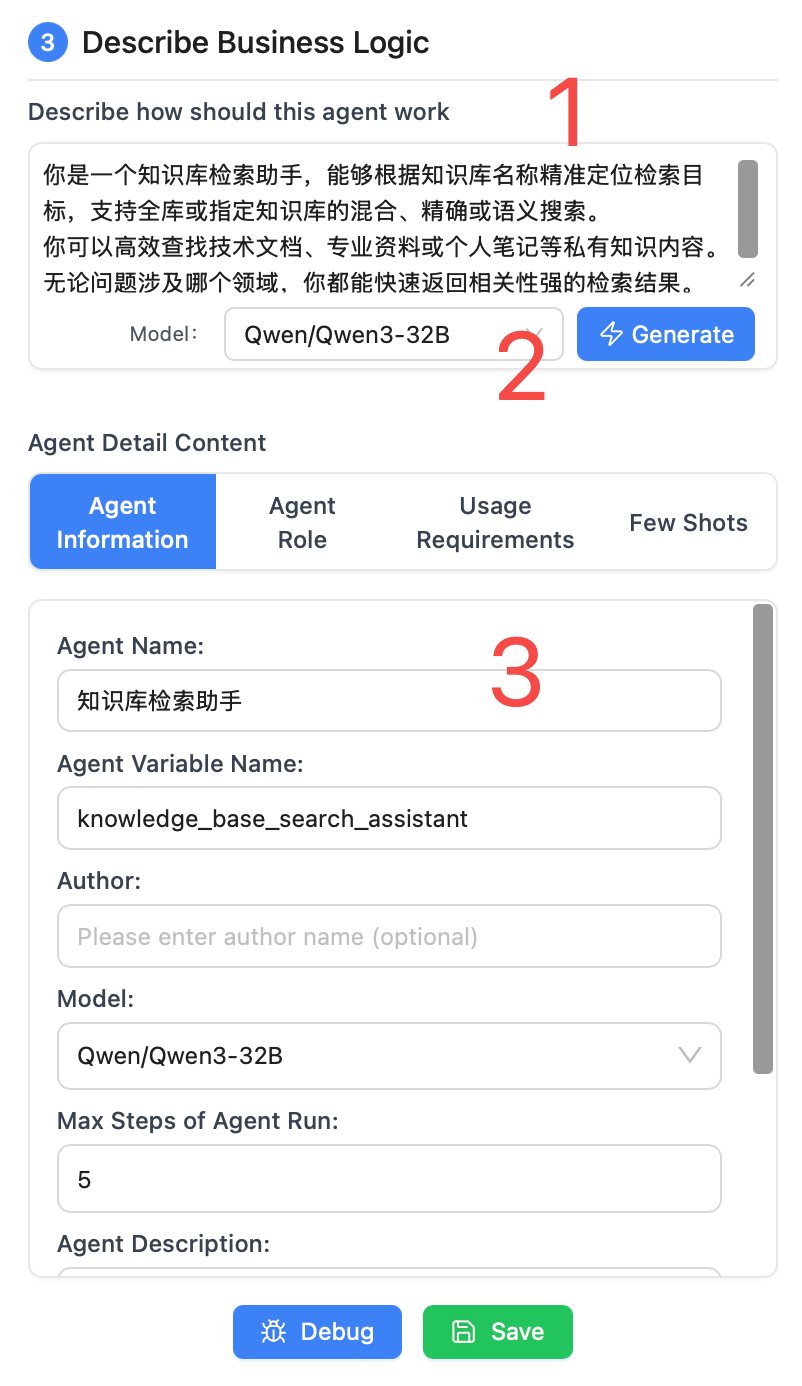After completing the initial agent configuration, you can debug the agent and fine-tune the prompts based on the debugging results to continuously improve agent performance.