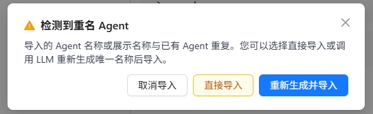 ⚠️ 提示:如果导入了重名的智能体,系统会弹出提示弹窗。您可以选择: